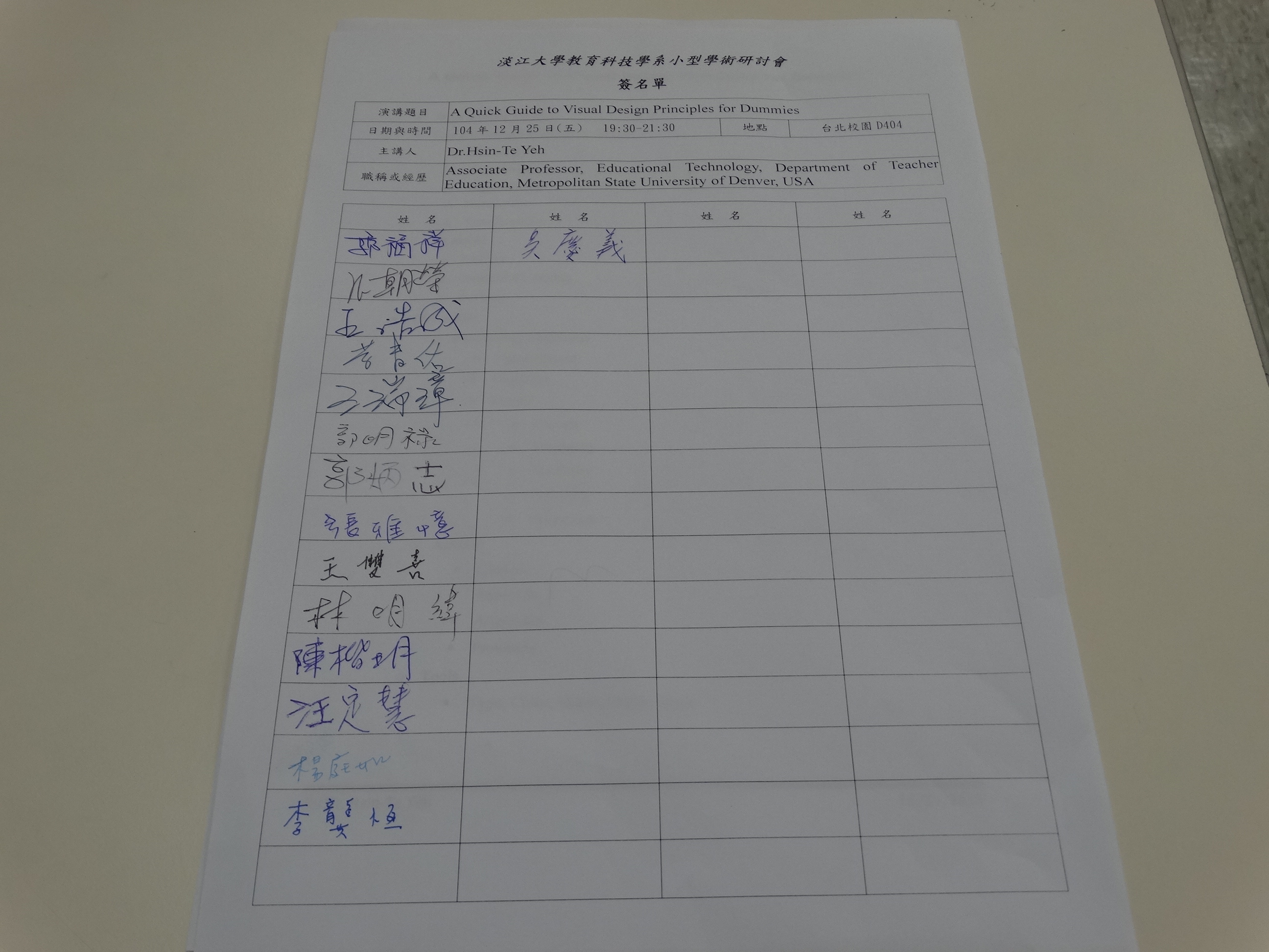 104年12月25日(五) 19:30-21:3(地點:台北校園D404) A Quick Guide to Visual Design Principles for Dummies 淡江大學教育科技學系
