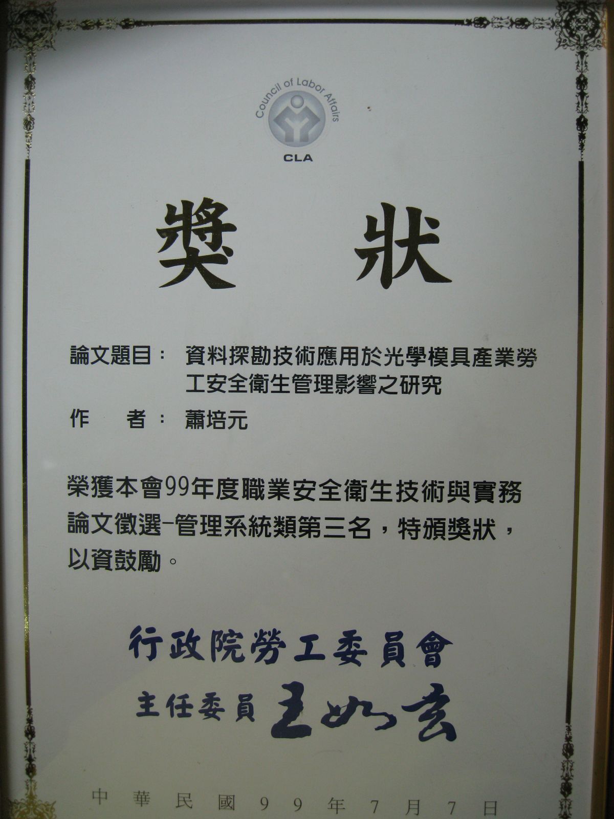 99.07.01 行政院勞委會 職業安全全國實務論文競賽