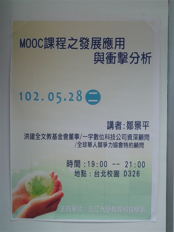 學習已經可以超越時空的限制,只要空閒時間上網,就能參與各國名校的課程,想必這會是多麼有趣又令人難忘的經驗啊! 我也應該多多涉獵關於coursea 等開放課程,正如同鄒顧問所提到的,多聽多看多觀察那些老師的上課技巧及風範,以期自己也可以學習之,讓自己的教學更加多元化! 此外,也真的很佩服鄒顧問的學習精神,終身學習的態度也是我們值得學習的,為人教師者,真的需要不斷充實自己,多參加研習課程,吸收新知能,教學才能符應當代學生的需求。最後特別感謝鄒顧問撥空前來,準備十分豐富的資料及實務經驗與我們分享,真的受益良多! 也感謝黃老師的精心安排!!